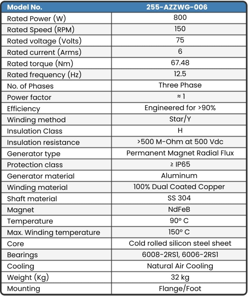 Our 255-AZZWG-006, the 800 W 150 RPM Wind Turbine Alternator, has been used in small wind turbines for over 5 years. This unit can be configured with a vertical or horizontal axis wind turbine turning at 150 RPM. The most popular configuration on our low RPM Permanent Magnet Alternator is an aluminium body with flange mounting on either the front or the back end covers, which makes it a versatile choice for wind applications.