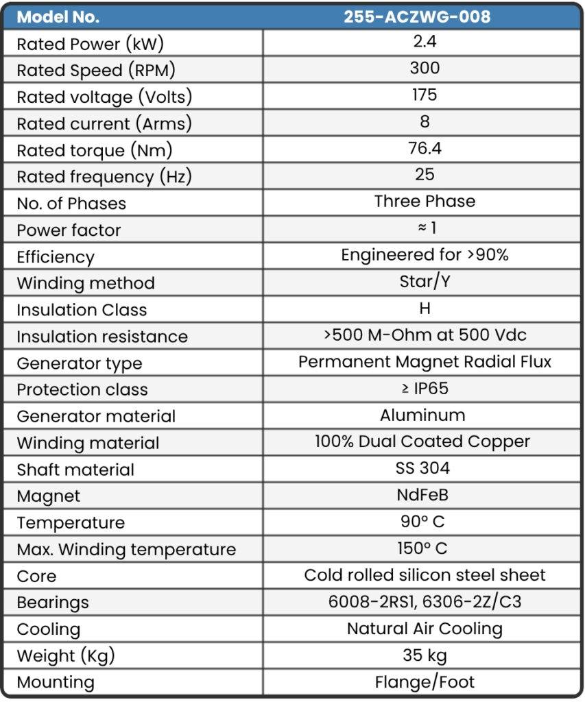 Our 255-ACZWG-008, the 2.4kW 300 RPM Wind Turbine Alternator has been used in small wind turbines for over 5 years. This unit can be configured with a vertical or horizontal axis turbine, tuning at 300 RPM. The most popular configuration on our low RPM Permanent Magnet Alternator is an aluminium body with flange mounting on the front or the back end covers, making it a versatile choice for wind turbine applications.