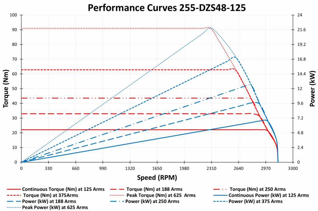 To ensure its reliability and endurance, we subjected the 255-DZS48-125 PMSM to rigorous testing. The motor was put through its paces with maximum current settings at 120 Arms, 180 Arms, 240 Arms and 360 Arms. Even under these demanding conditions, the motor exhibited resilience, with maximum temperatures reaching just 73 degrees, 103 degrees, 120 degrees and 143 degrees Celsius during one-hour continuous testing.