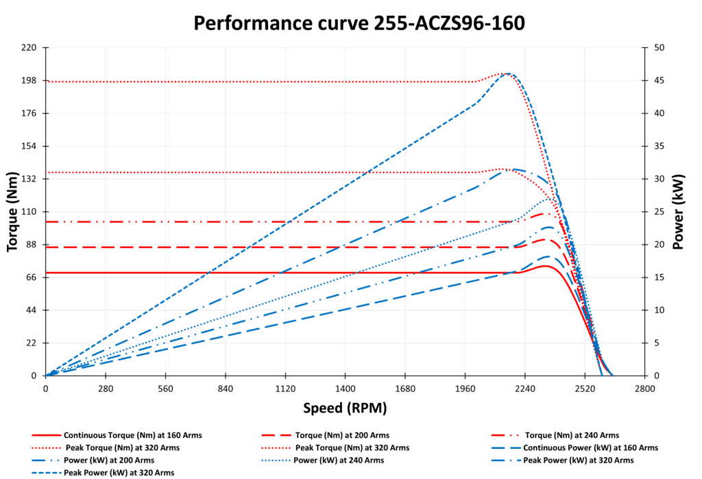 The 255-ACZS96-160Permanent Magnet Synchronous Motor (PMSM) is a high-performance 15 kW 96VDC PM Synchronous motor, perfect for a variety of industrial and automotive applications. With over 90% efficiency, it ensures smooth, quiet, and energy-saving operation, making it an excellent choice for Electric and Hybrid vehicles, Agricultural equipment, Industrial Machinery, and more.