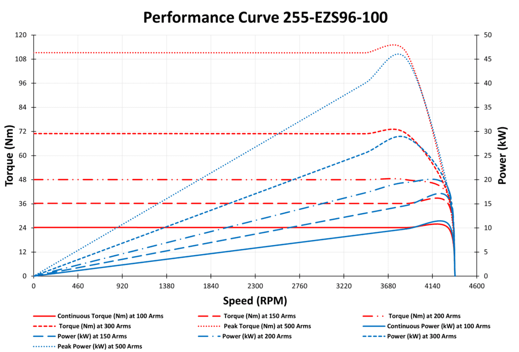 The 255-EZS96-100 Permanent Magnet Synchronous Motor (PMSM) is a high-performance 10.8 kW 96VDC PM Synchronous motor, perfect for a variety of industrial and automotive applications. With over 90% efficiency, it ensures smooth, quiet, and energy-saving operation, making it an excellent choice for Electric and Hybrid vehicles, Agricultural equipment, Industrial Machinery, and more.