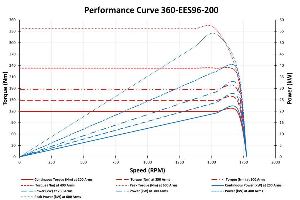 The 360-EES96-200 Permanent Magnet Synchronous Motor (PMSM) is a high-performance 19 kW 96VDC PM Synchronous motor delivering over 90% efficiency for electric and hybrid vehicles, construction equipment, and industrial systems. For more options in the same 96V PMSM range, explore our lineup of high-efficiency 48V motors. Innotec Power also offers PMSM motors in 24V, 72V, 48V, 320V, and 565V variants for varied applications.