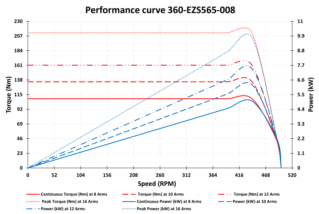The 360-EZS565-008 Low RPM Permanent Magnet Synchronous Motor (PMSM) is a 5 kW 400VAC motor, which also delivers a remarkable peak power of 9.7 kW, built to deliver high torque at controlled low speeds. With a rated speed of 450 RPM, this motor offers a continuous torque of 108.6 Nm. It reaches a peak torque of 211.9 Nm, making it an ideal solution for applications requiring strong, steady motion and energy efficiency. It ensures optimal performance even under demanding load conditions. Designed with advanced PMSM technology and efficiency above 90%, this motor is perfect for electric vehicles, agricultural equipment, hybrid systems, and industrial machinery where precision low RPM operation is essential.