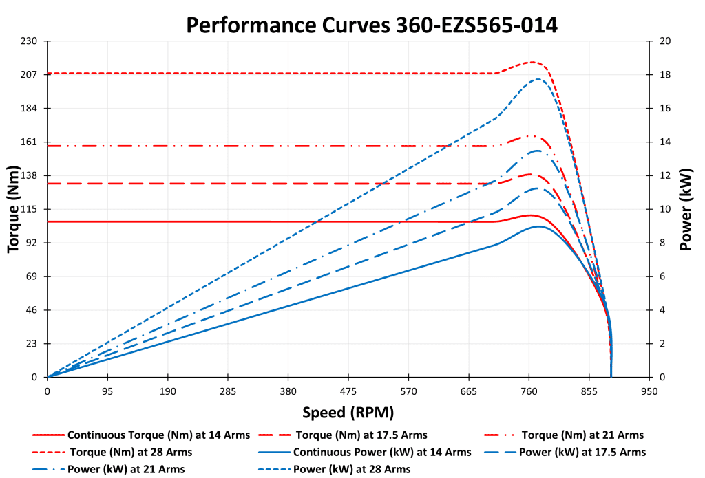 The 360-EZS565-014 Low RPM Permanent Magnet Synchronous Motor (PMSM) is a 8 kW 400VDC motor, which also delivers a remarkable peak power of 17.2 kW, built to deliver high torque at controlled low speeds. With a rated speed of 750 RPM, this motor offers a continuous torque of 106.4 Nm. It reaches a peak torque of 208 Nm, making it an ideal solution for applications requiring strong, steady motion and energy efficiency. It ensures optimal performance even under demanding load conditions. Designed with advanced PMSM technology and efficiency above 90%, this motor is perfect for electric vehicles, agricultural equipment, hybrid systems, and industrial machinery where precision low RPM operation is essential.