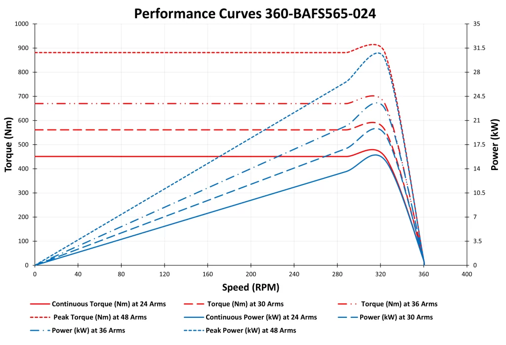 The 360-BAFS565-024 High Voltage Permanent Magnet Synchronous Motor (PMSM) is a 15 kW 400VAC motor, which also delivers a remarkable peak power of 30 kW, built to provide high torque at controlled low speeds. With a rated speed of 300 RPM, this motor offers a continuous torque of 451 Nm. It reaches a peak torque of 881 Nm, making it an ideal solution for applications requiring strong, steady motion and energy efficiency. It ensures optimal performance even under demanding load conditions. Designed with advanced PMSM technology and efficiency above 90%, this motor is perfect for electric vehicles, agricultural equipment, hybrid systems, and industrial machinery where precision, low RPM operation is essential.
