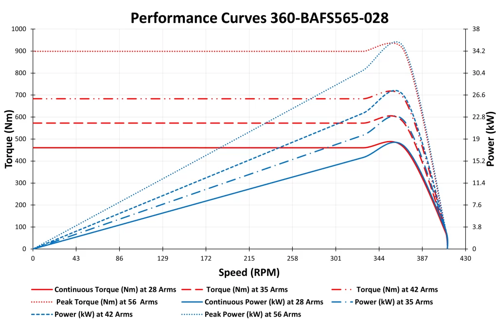 The 360-BAFS565-028 High Voltage Permanent Magnet Synchronous Motor (PMSM) is a 17 kW 400VAC motor, which also delivers a remarkable peak power of 34.7 kW, built to provide high torque at controlled low speeds. With a rated speed of 360 RPM, this motor offers a continuous torque of 460 Nm. It reaches a peak torque of 899 Nm, making it an ideal solution for applications requiring strong, steady motion and energy efficiency. It ensures optimal performance even under demanding load conditions. Designed with advanced PMSM technology and efficiency above 90%, this motor is perfect for electric vehicles, agricultural equipment, hybrid systems, and industrial machinery where precision, low RPM operation is essential.