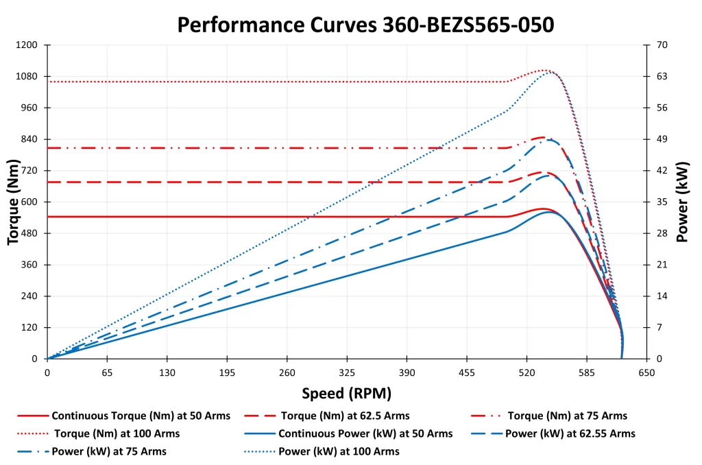 The 360-BEZS565-050 High Voltage Permanent Magnet Synchronous Motor (PMSM) is a 30 kW 400VAC motor, which also delivers a remarkable peak power of 62kW, built to provide high torque at controlled low speeds. With a rated speed of 500 RPM, this motor offers a continuous torque of 543 Nm. It reaches a peak torque of 1060 Nm, making it an ideal solution for applications requiring strong, steady motion and energy efficiency. It ensures optimal performance even under demanding load conditions. Designed with advanced PMSM technology and efficiency above 90%, this motor is perfect for electric vehicles, agricultural equipment, hybrid systems, and industrial machinery where precision, low RPM operation is essential.