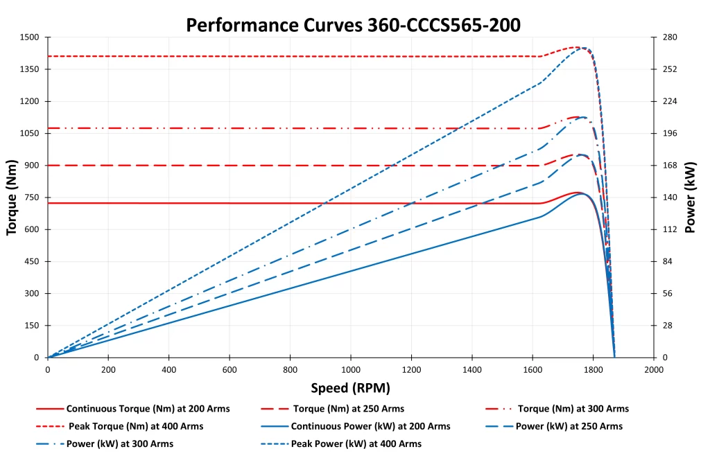 The 360-CCCS565-200 High Voltage Permanent Magnet Synchronous Motor (PMSM) is a 120 kW 400VAC motor, which also delivers a remarkable peak power of 262.7 kW, built to provide high torque at controlled low speeds. With a rated speed of 1600 RPM, this motor offers a continuous torque of 722.4 Nm. It reaches a peak torque of 1411.6 Nm, making it an ideal solution for applications requiring strong, steady motion and energy efficiency. It ensures optimal performance even under demanding load conditions. Designed with advanced PMSM technology and efficiency above 90%, this motor is perfect for electric vehicles, agricultural equipment, hybrid systems, and industrial machinery where precision, low RPM operation is essential.