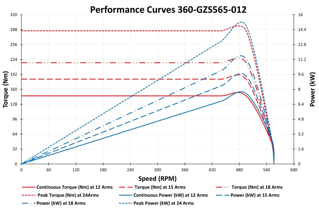 The 360-GZS565-012 High Voltage Permanent Magnet Synchronous Motor (PMSM) is a 7 kW 400VAC motor, which also delivers a remarkable peak power of 14.8 kW, built to provide high torque at controlled low speeds. With a rated speed of 450 RPM, this motor offers a continuous torque of 146 Nm. It reaches a peak torque of 285.6 Nm, making it an ideal solution for applications requiring strong, steady motion and energy efficiency. It ensures optimal performance even under demanding load conditions. Designed with advanced PMSM technology and efficiency above 90%, this motor is perfect for electric vehicles, agricultural equipment, hybrid systems, and industrial machinery where precision, low RPM operation is essential.