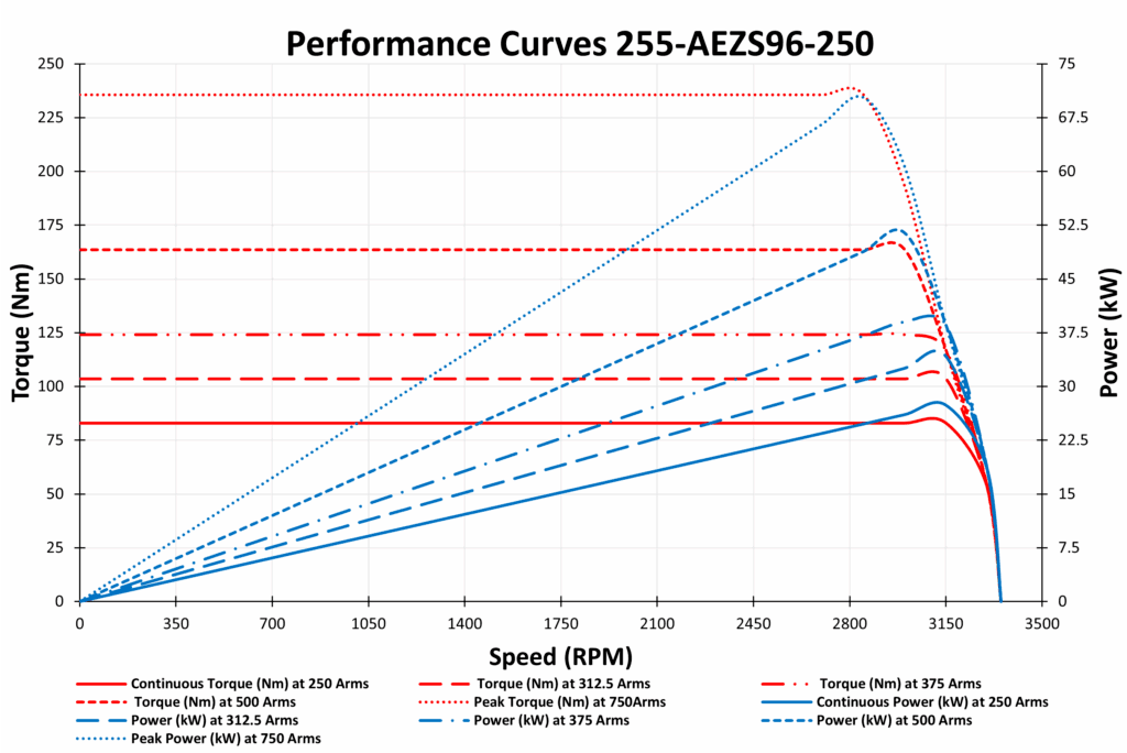 The 255-AEZS96-250 Permanent Magnet Synchronous Motor (PMSM) is a high-performance 25 kW 96VDC PM Synchronous motor, perfect for a variety of industrial and automotive applications. With over 90% efficiency, it ensures smooth, quiet, and energy-saving operation, making it an excellent choice for Electric and Hybrid vehicles, Agricultural equipment, Industrial Machinery, and more.