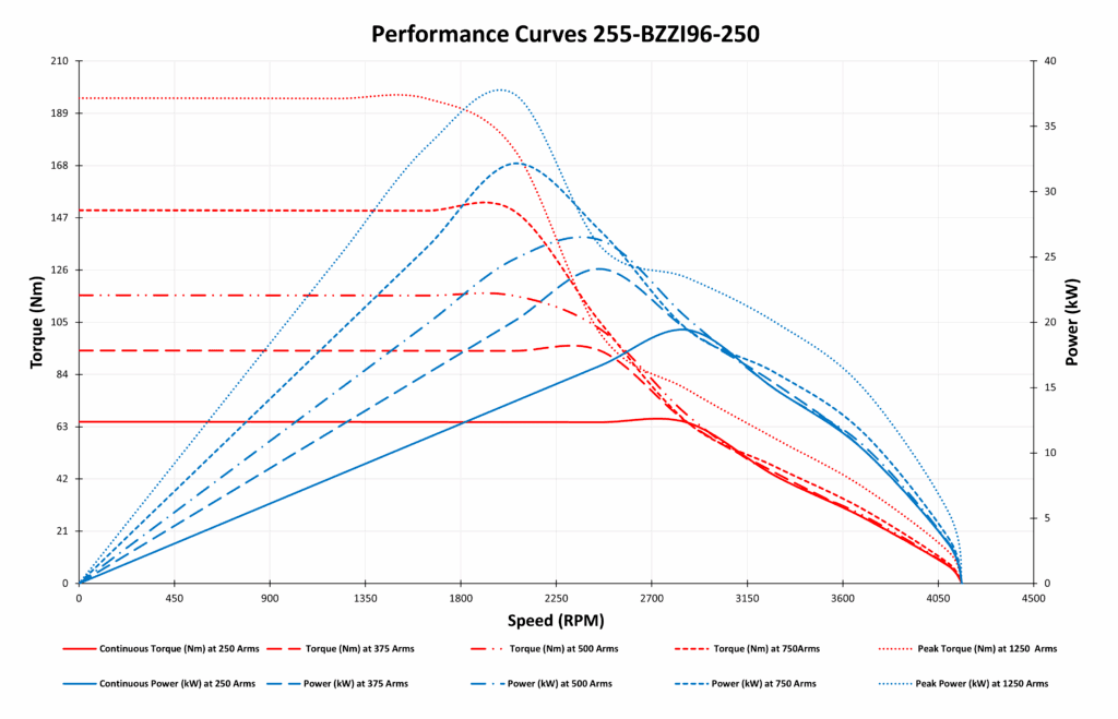 The 255-BZZI96-250 Permanent Magnet Synchronous Motor (PMSM) is a high-performance 19 kW 96VDC PM Synchronous motor, perfect for a variety of industrial and automotive applications. With over 90% efficiency, it ensures smooth, quiet, and energy-saving operation, making it an excellent choice for Electric and Hybrid vehicles, Agricultural equipment, Industrial Machinery, and more.