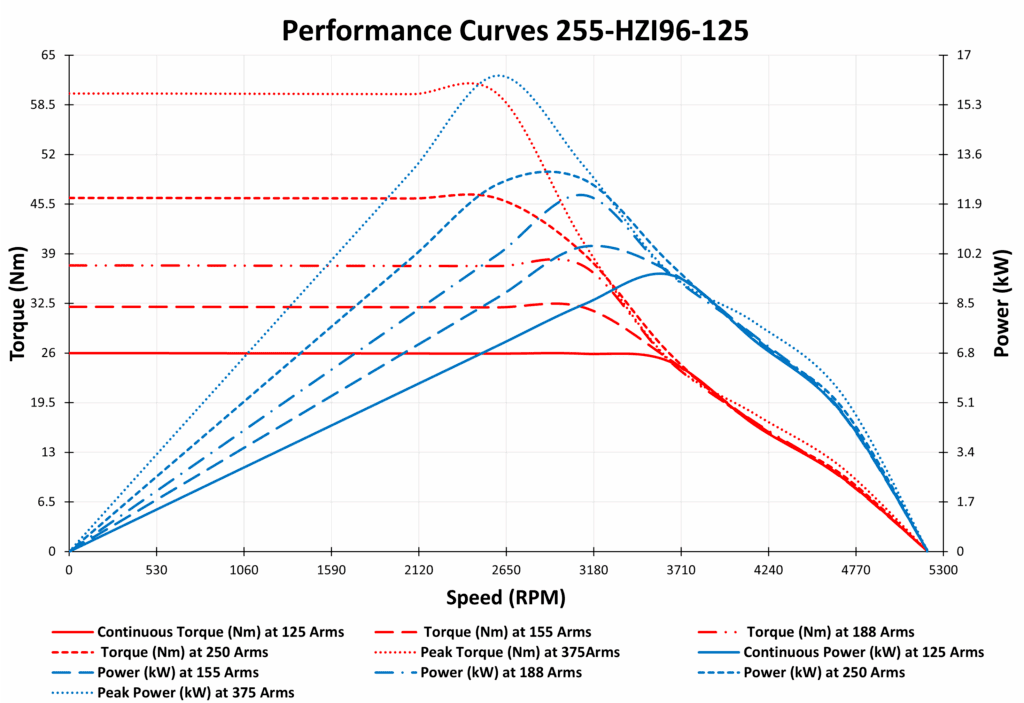 The 255-HZI96-125 Permanent Magnet Synchronous Motor (PMSM) is a high-performance 9 kW 96VDC PM Synchronous motor, perfect for a variety of industrial and automotive applications. With over 90% efficiency, it ensures smooth, quiet, and energy-saving operation, making it an excellent choice for Electric and Hybrid vehicles, Agricultural equipment, Industrial Machinery, and more.