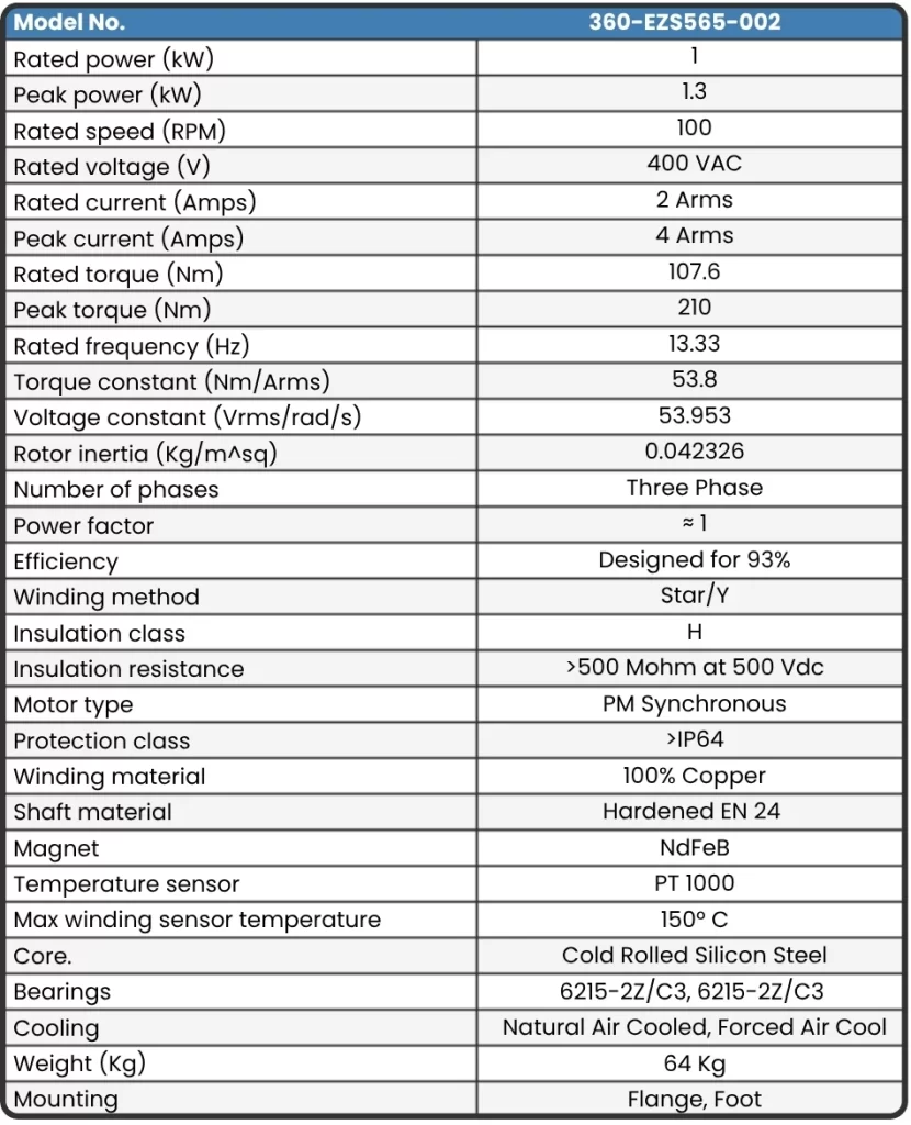 The 360-EZS565-002 Low RPM Permanent Magnet Synchronous Motor (PMSM) is a 1 kW 400VDC motor, which also delivers a remarkable peak power of 1.3 kW, built to deliver high torque at controlled low speeds. With a rated speed of 100 RPM, this motor offers a continuous torque of 107.6 Nm. It reaches a peak torque of 210 Nm, making it an ideal solution for applications requiring strong, steady motion and energy efficiency. It ensures optimal performance even under demanding load conditions. Designed with advanced PMSM technology and efficiency above 90%, this motor is perfect for electric vehicles, agricultural equipment, hybrid systems, and industrial machinery where precision low RPM operation is essential.